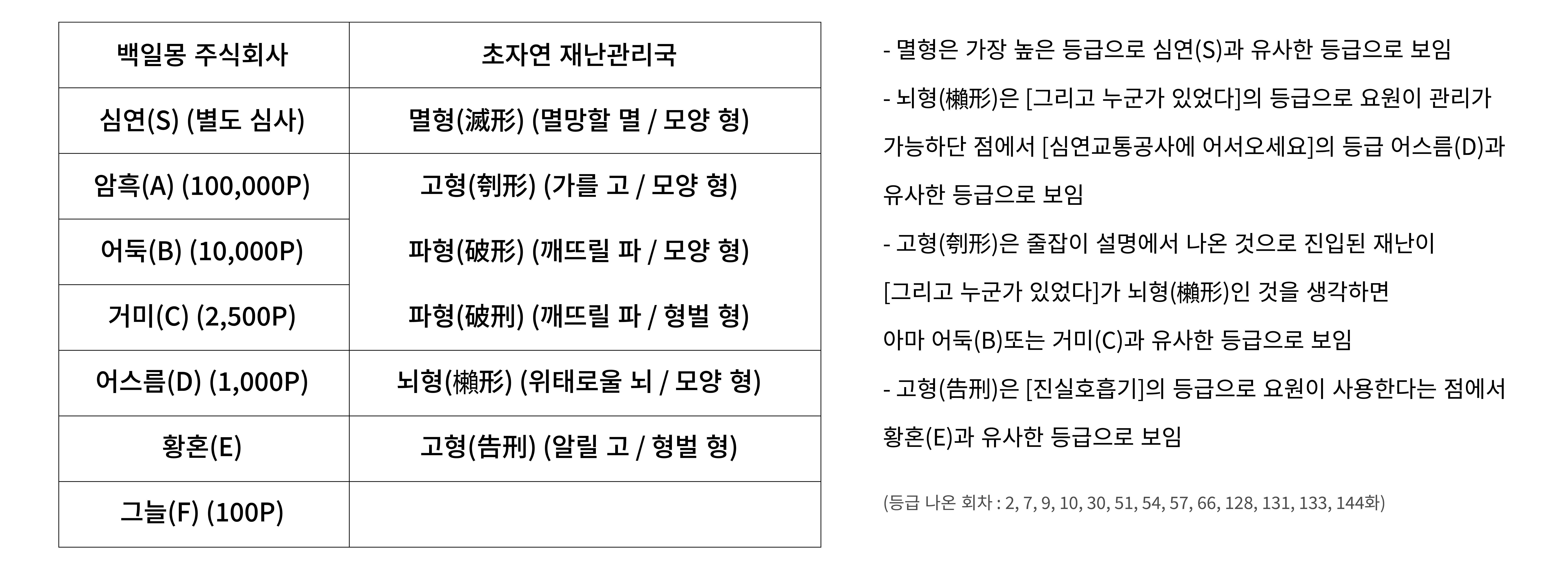 안녕하세요. 오랜만에 추리입니다!원작에서 주는 명확한 정보는 백일몽 주식회사 등급과 초자연 재난관리국 멸형과 파형 등급 설명이죠. 그래서 등급 정리하는 겸 초자연 재난관리국 등급 추리를 표로 만들어 올려봅니다! 옆에는 추리입니다!